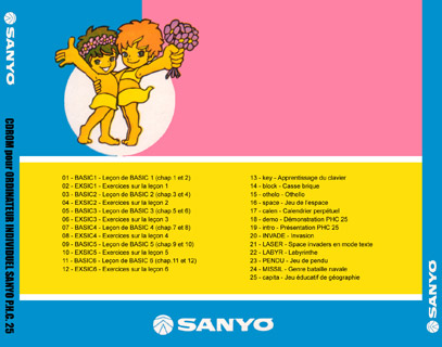 Le 'CDROM' pour le Sanyo PHC-25 Cette première version du 'CDROM' contient 25 programmes originaux pour le Sanyo PHC-25 sous forme de 25 pistes audio. L'idée n'est pas d'encourager la copie des programmes mais de faire revivre, trente ans après, cet ordinateur familial d'initiation Pour les nouveaux venus, cette collection permettra de découvrir cette petite machine si sympathique.
