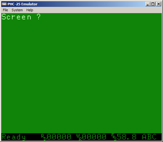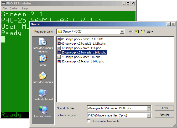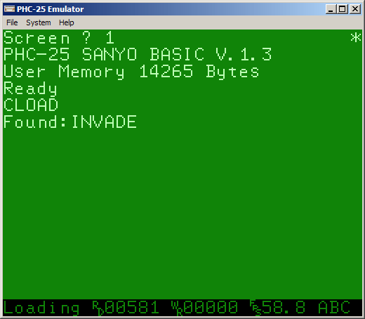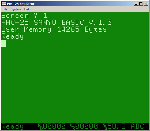 Un émulateur du Sanyo PHC-25 Un émulateur du PHC-25 a été développé en 2004 au Japon. Malheureusement, il était incompatible avec la ROM de la version PAL du Sanyo. Cliquez ici pour télécharger l'émulateur, quelques exemples et des utilitaires. Le fichier comprend l'émulateur, des dumps de cassettes réalisés par Gilles ainsi que les utilitaires nécessaires Mode d'emploi (Quick Start) 1. Lancez l'émulateur. L'écran d'accueil sur PHC-25 apparaît.