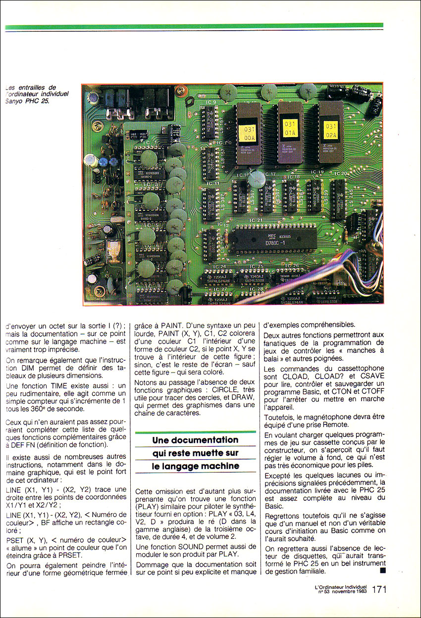 Les tests, les publicités, les brochures concernant le PHC-25 L'Ordinateur Individuel n°53 Novembre 1983 [ page précédente ] - [ retour à la rubrique presse ] - [ page suivante ] [ page précédente ] - [ retour à la rubrique presse ] - [ page suivante ] |
