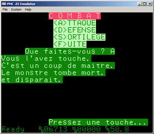 Projets et nouveaux développements autour du PHC-25 Cette nouvelle rubrique regroupe les nouveaux développements logiciels dédiés au Sanyo PHC-25. Si vous avez réalisé un utilitaire original, un portage de logiciel existant ou quoi que ce soit d'autre, contactez-moi ! Très célèbre logiciel sorti sur Philips VG5000µ, Citadelle est un jeu d'aventure textuel en plusieurs parties vous plongeant entre énigmes, trésors et autres monstres. David Bourg n'a pas simplement réalisé un portage du listing original, il l'a débuggé et surtout considérablement enrichi. David m'a fait l'honneur de distribuer son travail sur phc25.com et de présenter son parcours et l'histoire de ce développement de plusieurs mois :
